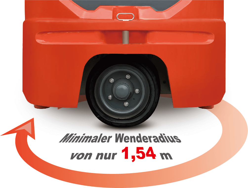 Die Lenkbrücke mit großem Winkel verkleinert den Wenderadius, sodass der Be- und Entladevorgang im Schmalgang druckfrei ist.